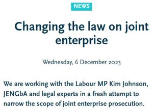 The Centre for Crime and Justice has been working with MP Kim Johnson and JENGbA on the Joint Enterprise issue,