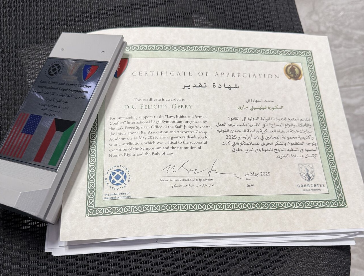 Felicity spent some of May in Kuwait, where she spoke on panels at the Law, Ethics and Armed Conflict Conference on the intersection between international criminal law and Islamic law, and on corporate liability for war crimes. The conference was organised by The Office of the Staff Judge Advocate of Operation Spartan Shield, the Human Rights Law Committee of the International Bar Association (IBA), Advocates Group Academy and JuraLaw.