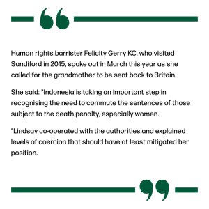 Felicity has recently called on the UK to strike a deal with the Indonesian government to bring the incarcerated British